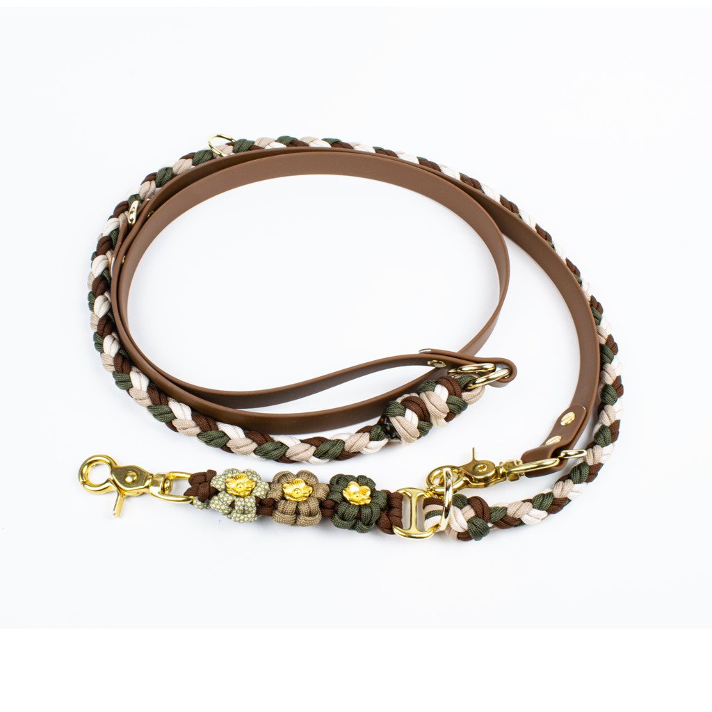 Der Blumen-Hundeleine von Tierluxe kombiniert Stil und Funktionalität in einem. Hergestellt aus hochwertigen Materialien wie Paracord und Biothane, bietet diese Leine nicht nur Robustheit, sondern auch Komfort bei Spaziergängen mit Ihrem Hund. Das Modell verfügt über fünf verschiedene Längen- und Griffkonfigurationen, was es äußerst flexibel macht – Sie können es ganz einfach an Ihre Bedürfnisse anpassen. Die Leinen sind sorgfältig farblich auf die Halsbänder der Blumen-Serie abgestimmt, sodass Sie ein perfektes Set zusammenstellen können. Das Design der Leine umfasst natürliche Farben, die dem Accessoire einen stilvollen und eleganten Look verleihen. Dank der farbigen Dekorationselemente hebt sie sich durch ihre feinen Details hervor und bleibt dabei dennoch funktional. Mit dem Komfort des Hundes und der Bequemlichkeit des Besitzers im Sinn bietet die Blumen-Leine maximalen Komfort bei täglichen Spaziergängen. Egal, ob Sie ein klassisches Braun-Grün-Set oder ein zartes Rosa bevorzugen – Tierluxe bietet ein Design, das die Individualität Ihres Haustieres unterstreicht.